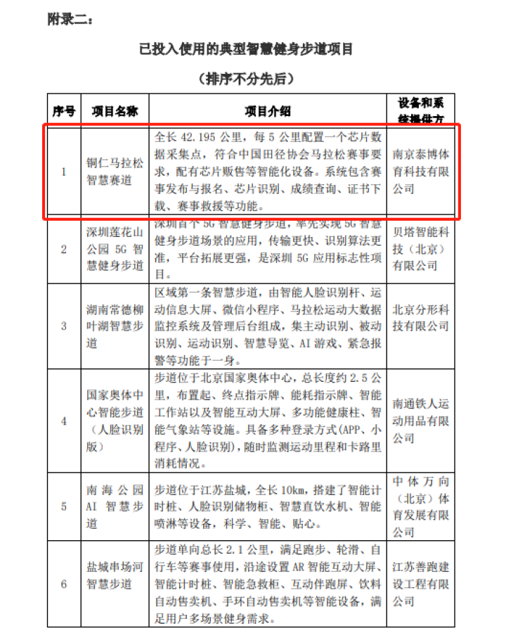 铜仁马拉松智慧赛道全长42.195公里,起点位于碧江区八官溪河岸,经20多个村寨,沿锦江河铺设,终点讫于江口县两河口河岸。赛道每5公里配置一个芯片数据采集点,可通过人脸识别和芯片识别两种方式自动记录运动成绩,同时配置陪跑灯光、自动感应淋浴系统、智慧AED救援站、智能心率柱、智能存包柜、太阳能座椅、自助充电桩、自助售卖及卫生间、更衣室等设备设施。沿途风光秀丽,是一条集乡村振兴、户外运动、体育赛事、休闲度假、旅游观光、康养娱乐等业态为一体的智慧赛道。