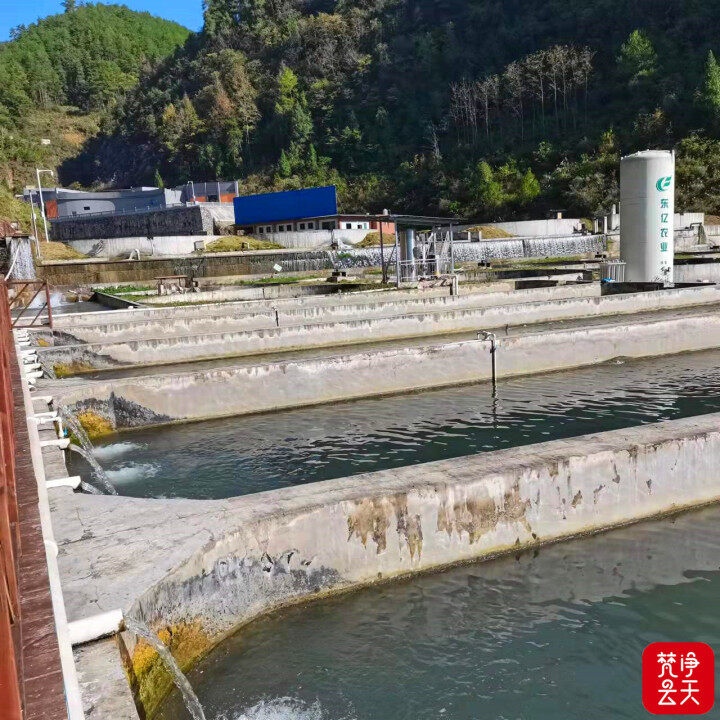 占地80亩的鲟鱼养殖基地被青山环抱,清澈的双泉河穿过基地,源源不断的清冽泉水为鲟鱼提供了适宜的生长环境。