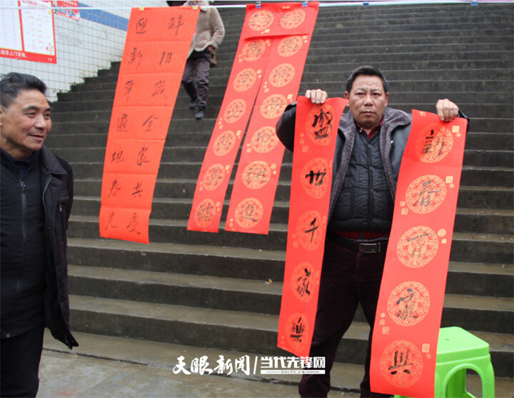 活动现场一幅幅红色春联整齐平铺,寓意喜庆、美好的祝福散发着浓浓的墨香,给现场增添了浓浓的年味,渲染出了春节的喜庆氛围。
