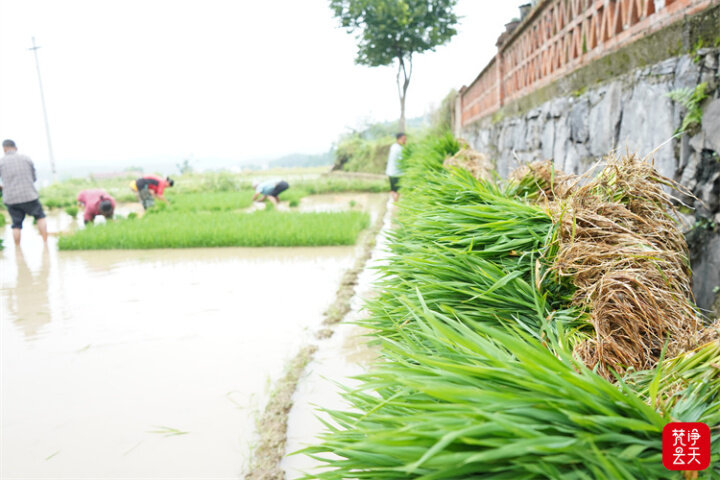 听正在拔秧的嬢嬢说:"刚收完油菜,又开始插秧,庄稼轮番种,田土不撂荒。村里天天宣传不准土地撂荒,所以我今年就育了半亩田的秧苗,把所有的田都耕起来,多种点粮食。"
