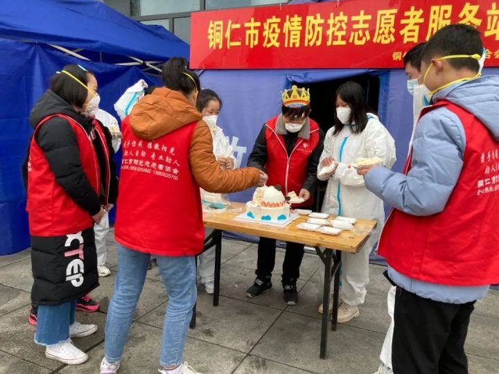 “祝你生日快乐……”在铜仁火车站疫情防控志愿者服务站前,志愿者们把谢晓林围在中间,为他戴上生日帽,点燃生日蜡烛,齐声唱响了生日祝福歌,大家争先恐后地为口中的谢伯伯送上生日祝福,让谢晓林在忙碌中度过了一个又暖又甜的67岁生日。