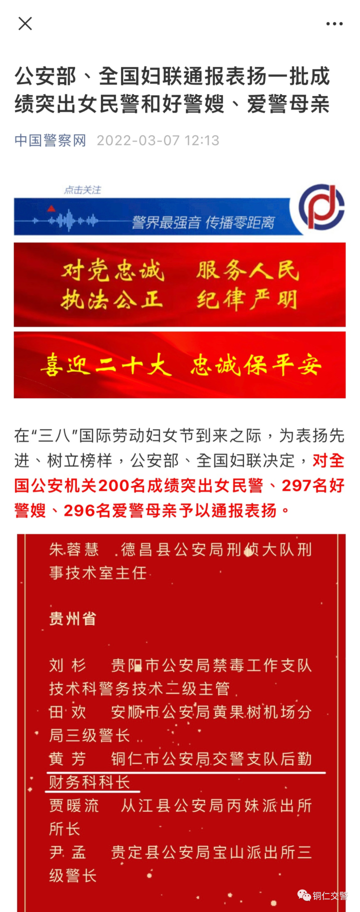在“三八”国际劳动妇女节到来之际,为表扬先进、树立榜样,公安部、全国妇联决定,对全国公安机关200名成绩突出女民警、297名好警嫂、296名爱警母亲予以通报表扬。铜仁市公安交通管理局民警黄芳荣获全国公安机关200名成绩突出女民警称号。
